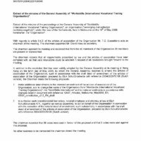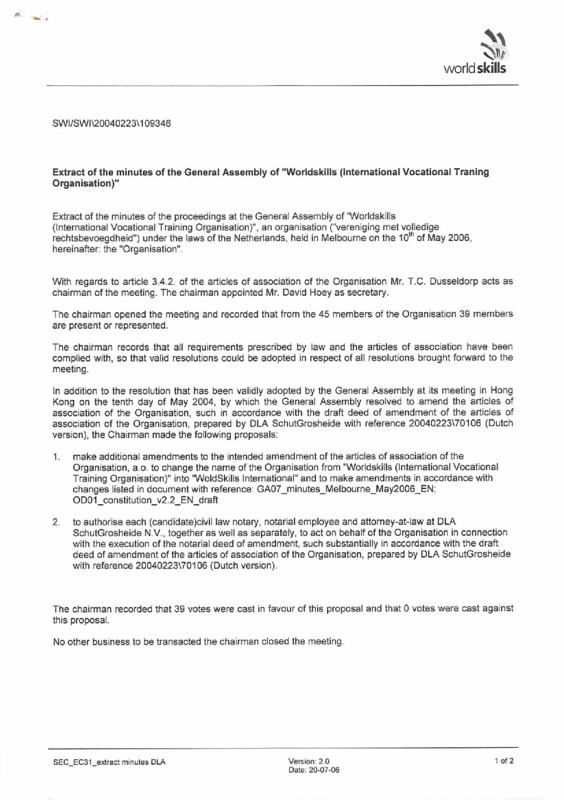- Extract of the minutes of the General Assembly of WorldSkills (International Vocational Training Organisation), held in Melbourne on 10 May 2006. The extract records that the GA reconfirmed and expanded upon the amendment of the Articles of Association originally approved on 10 May 2004 (Hong Kong). It approved additional amendments, including changing the organisation's name to "WorldSkills International" and integrating further revisions