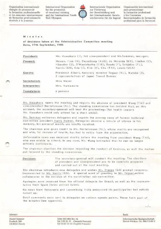 - Minutes of the Administrative Committee meeting held in Bern on 27 September 1984. The document records attendance, decisions adopted on outstanding membership fees, financial matters, contacts with new countries, preparations for the 28th International Vocational Training Competition in Osaka, constitutional revisions, Observer status, budget approval, and other administrative matters.