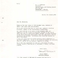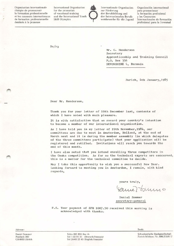 Subject: Reply acknowledging receipt of George Henderson’s letter of 19 December 1984, welcoming Bermuda’s intention to join the organization, informing about Committee meetings and the General Assembly in Amsterdam, noting the intention to enrol three Competitors in the Osaka competition, and stating that the Technical Committee will decide on technical Experts - Date