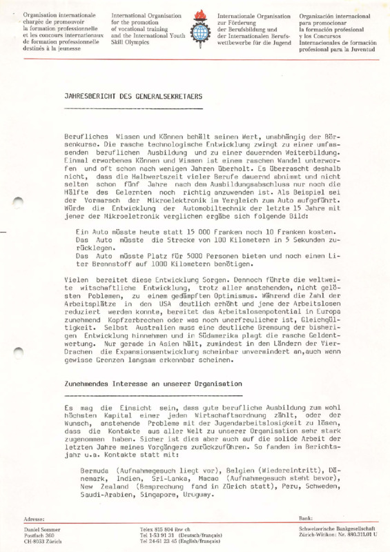 - Report issued by the Secretary-General reviewing the activities, developments, and outlook of the organization. The report addresses the value of vocational training in a context of technological change, international economic conditions, organizational growth, contacts with Member and prospective Member countries, admission of new Skill competitions, committee activities, administrative and financial matters, personal affairs, and future prospects. It includes references to committee meetings, international competitions, and organizational cooperation.