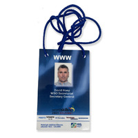 - Delegate badge with blue cord lanyard issued for WorldSkills Helsinki 2005. The printed badge includes a portrait photograph and identifies David Hoey, Secretary General of the WS Secretariat. The design features the WorldSkills Helsinki 2005 logo, event branding, sponsor logos, and local transport information. The badge is punched and suspended from a braided textile cord.