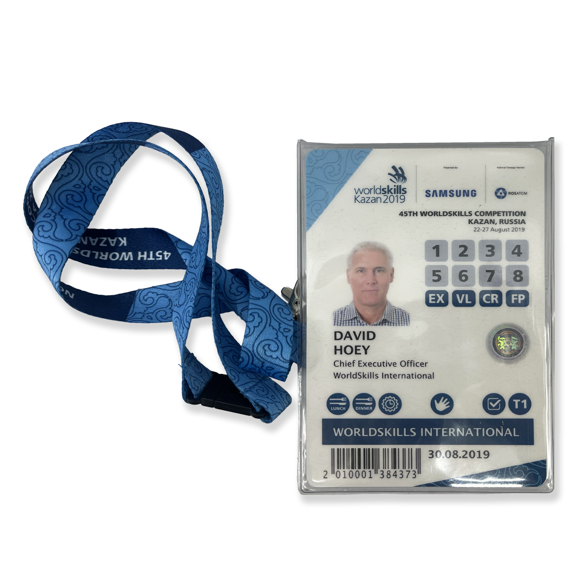 - Delegate badge with blue patterned fabric lanyard issued for the 45th WorldSkills Competition, Kazan 2019. The badge identifies David Hoey, Chief Executive Officer of WorldSkills International. The printed insert includes a portrait photograph, role and organization, barcode, access icons, and event branding. Logos displayed include WorldSkills Kazan 2019, Samsung (Presenting Partner), and Rosatom (National Strategic Partner). The badge is enclosed in a transparent plastic holder and attached to a fabric lanyard with safety clasp and metal hook.