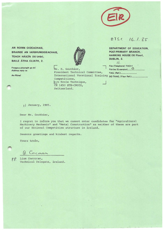 Subject: Ireland unable to enter candidates in Agricultural Machinery Mechanic and Metal Construction as these skills are not part of the national competition structure - Date