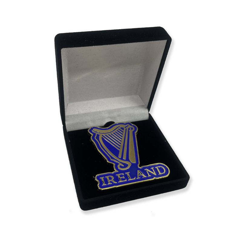 - Metal enamel lapel pin featuring the harp emblem of Ireland and the word “Ireland”, presented in a black hinged presentation case. The pin is finished in blue and gold enamel.