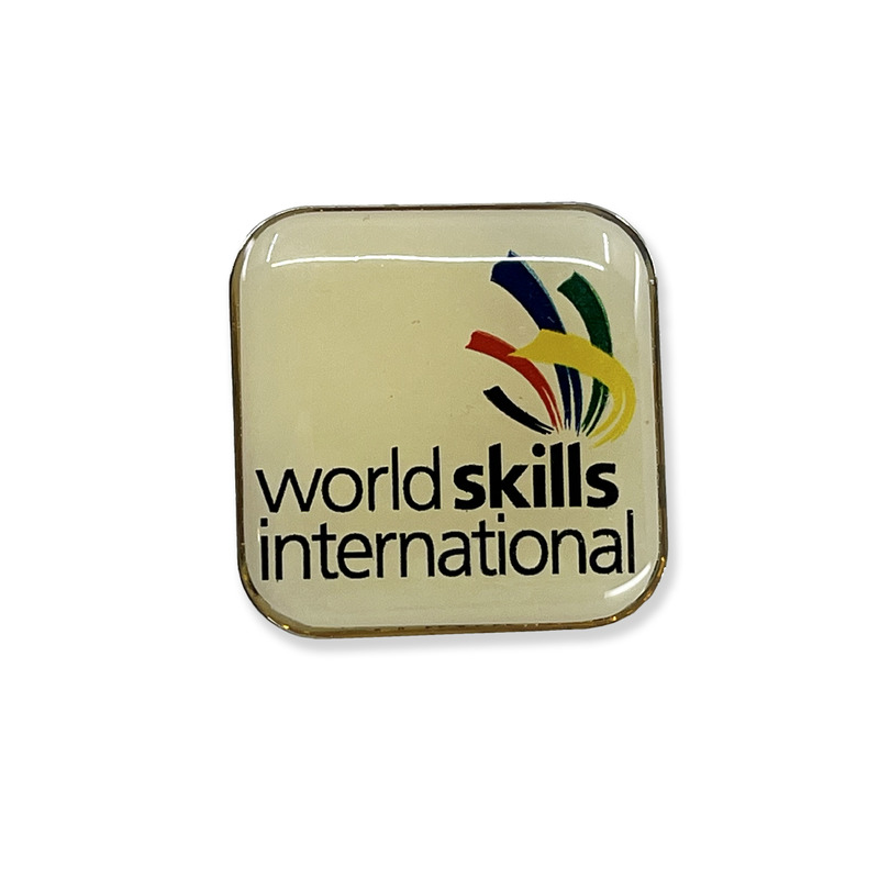 - Rounded square metal pin featuring the WorldSkills International logo. The surface is glossy enamel with a polished gold-tone metal edge.