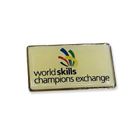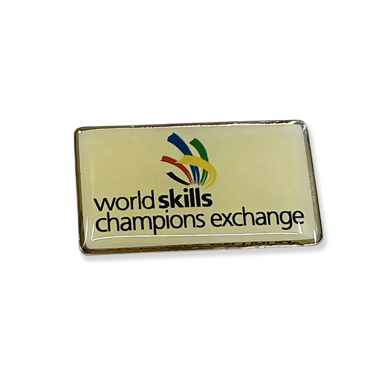 Rectangular metal pin with enamel decoration featuring the WorldSkills logo and the text “WorldSkills Champions Exchange”.