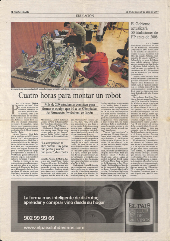 Press article: “Cuatro horas para montar un robot”, El País, 30/04/2007