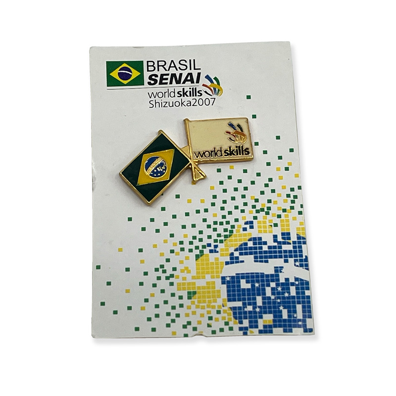 The pin depicts two crossed flags: the national flag of Brazil and a flag featuring the WorldSkills logo. It is mounted on its original presentation card, which reads “BRASIL SENAI WorldSkills Shizuoka 2007” - Date