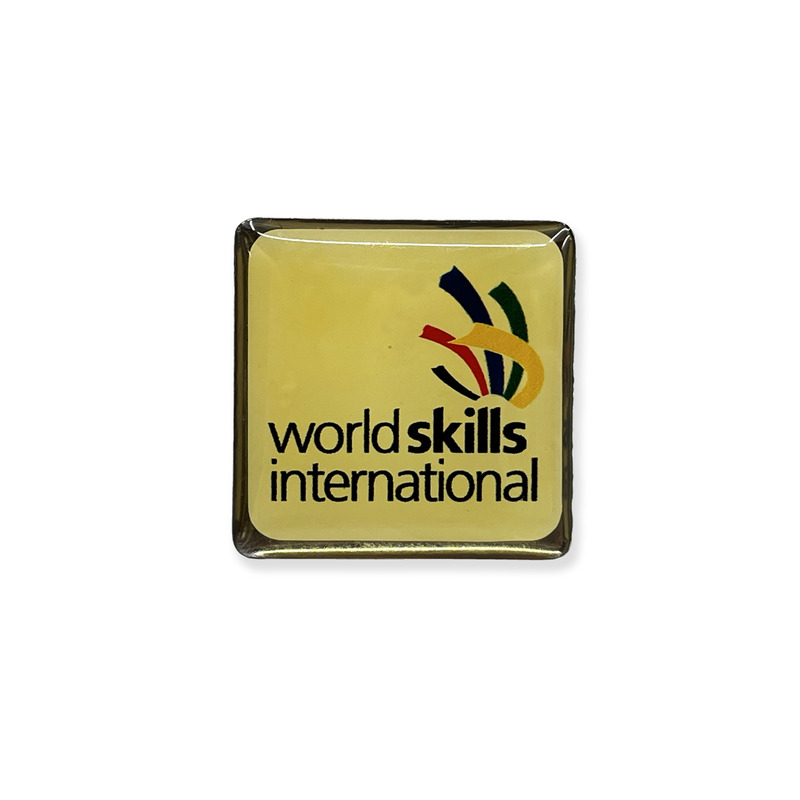 - Square metal pin featuring the WorldSkills International logo.
