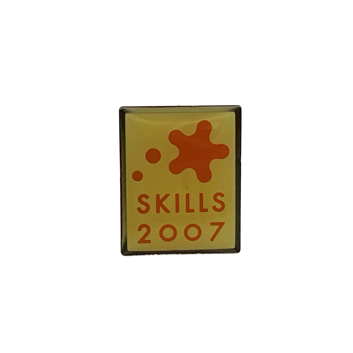 - Square metal pin produced for the 39th WorldSkills Competition, Shizuoka 2007, featuring the inscription “SKILLS 2007” and an abstract orange graphic motif composed of rounded shapes.
