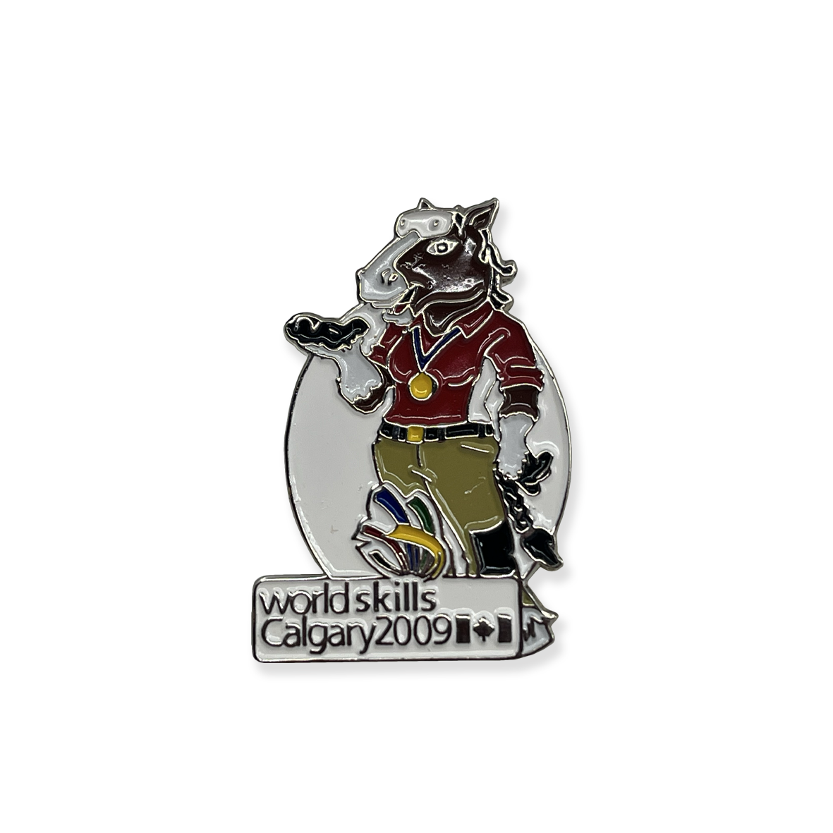 Metal pin produced for the 40th WorldSkills Competition, Calgary 2009, depicting Tess, the mare mascot of the event.