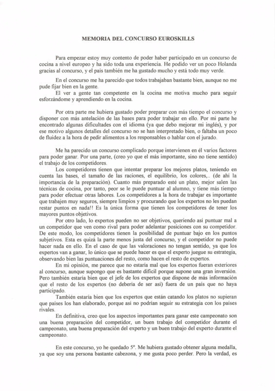 - Report titled “Memoria del concurso EuroSkills” by Antonio Romero, describing his personal experience participating as a Competitor in Cooking at the EuroSkills Rotterdam 2008 competition.