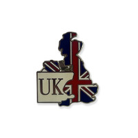 - Metal pin in the shape of the United Kingdom, featuring the Union Jack flag as the background and a speech-bubble element with the text “UK”.