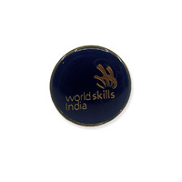 - Circular metal pin featuring the “WorldSkills India” logo on a dark blue background.