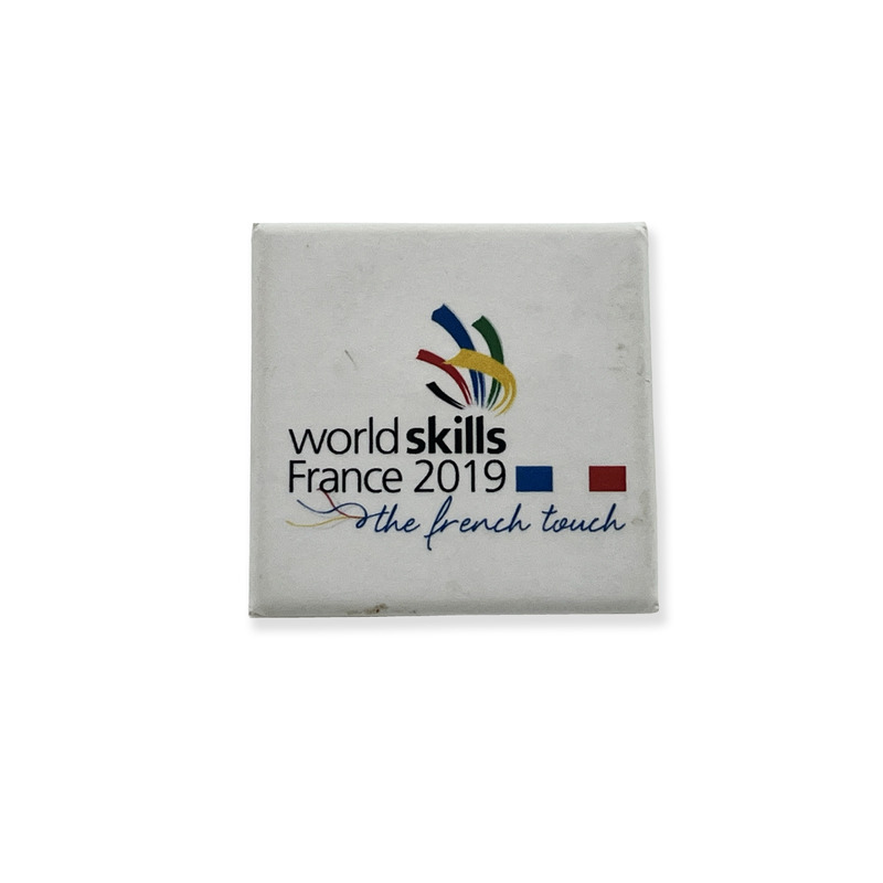 - Square pin featuring the WorldSkills France 2019 logo with and the slogan “the french touch”. Likely produced for a national competition or promotional use related to WorldSkills France 2019