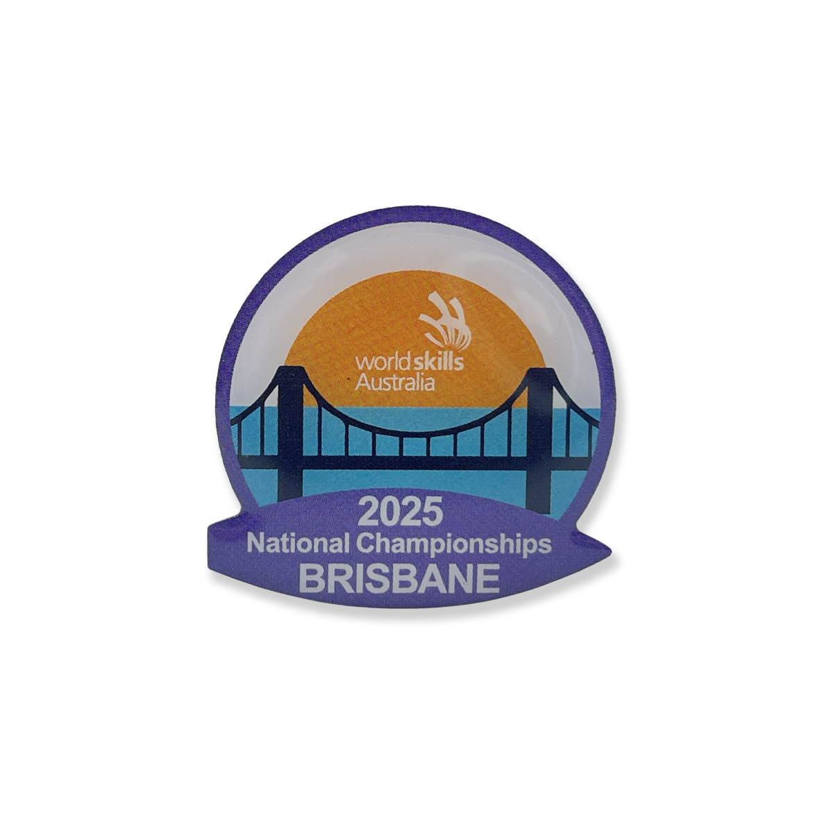 - Pin featuring the WorldSkills Australia logo with an illustration of a bridge and the text “2025 National Championships Brisbane”.