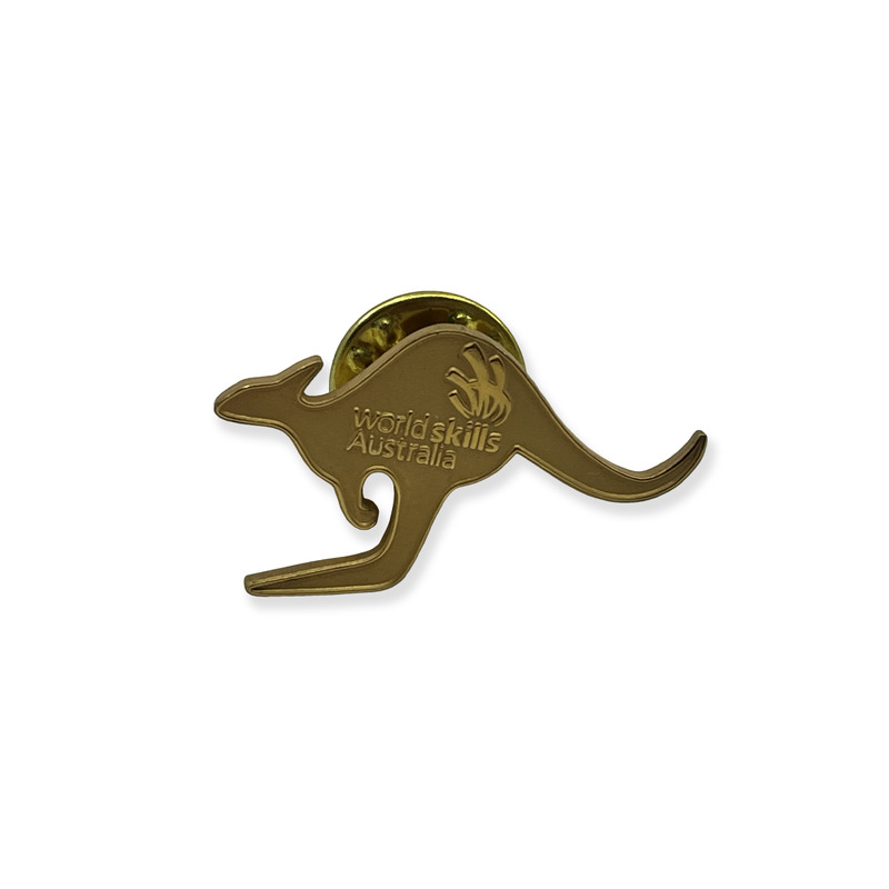 - Gold-coloured metal pin badge in the shape of a kangaroo featuring the WorldSkills Australia logo