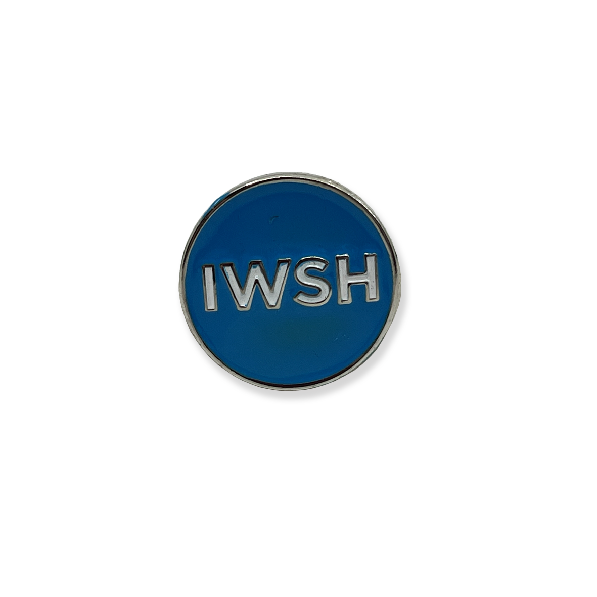 - Round metal pin badge with a blue enamel background and the acronym “IWSH” in silver lettering.