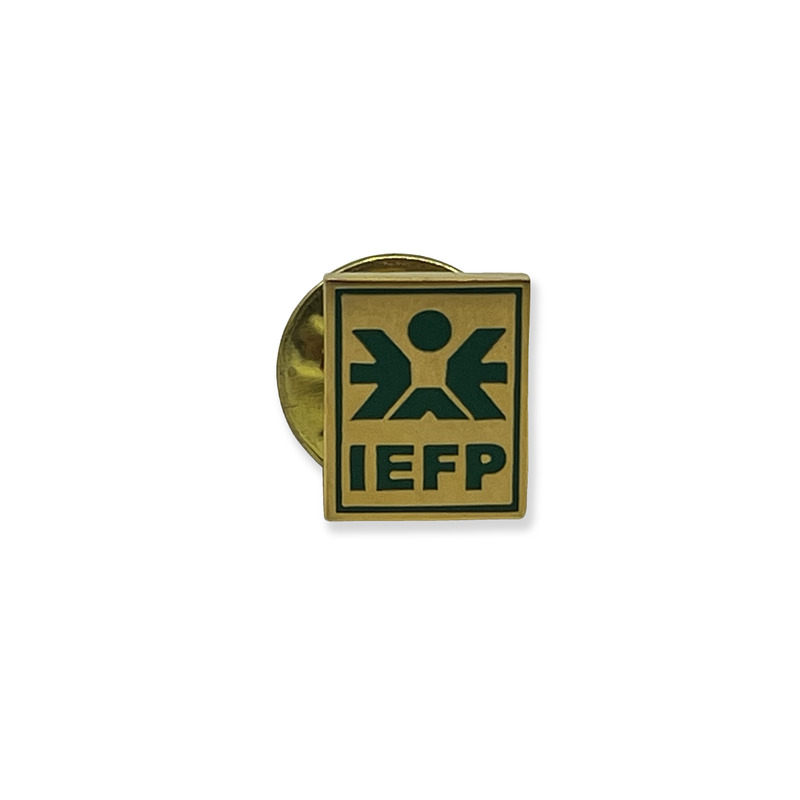 - Square metal pin badge featuring the acronym “IEFP” (Instituto do Emprego e Formação Profissional from Portugal),and a stylised human figure within a geometric design.