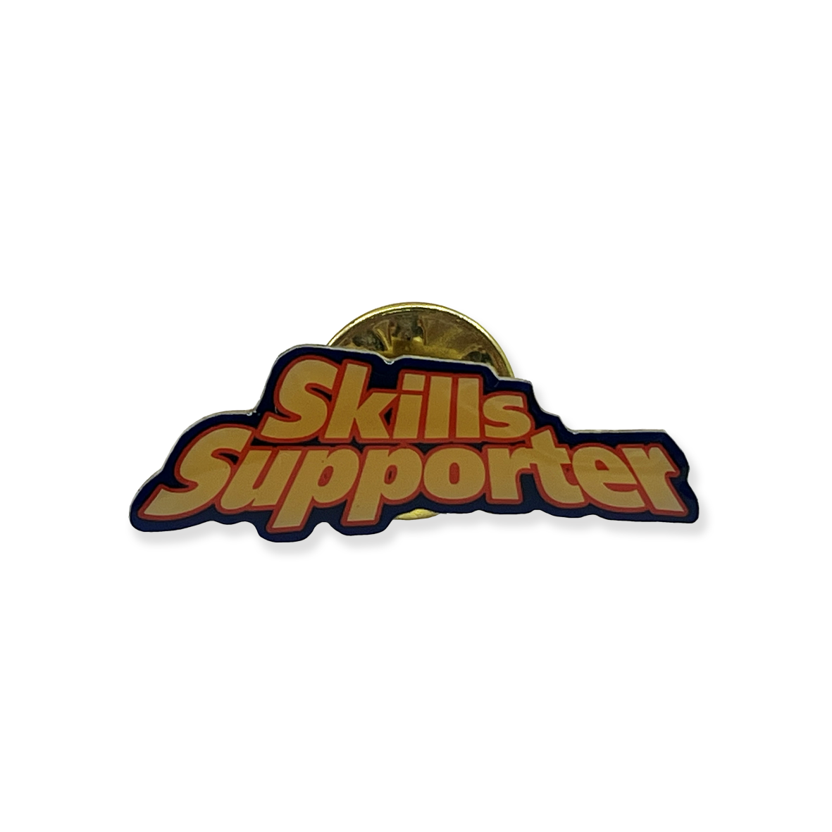 - Metal pin featuring the phrase “Skills Supporter” in lettering. Likely produced as a promotional or recognition item to identify individuals supporting skills competitions or related initiatives within the WorldSkills context.