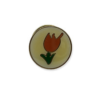 - Round metal pin badge featuring a stylised tulip with an orange flower and green leaves on a light background. The design likely references the Netherlands, where the tulip is a well-known national symbol.