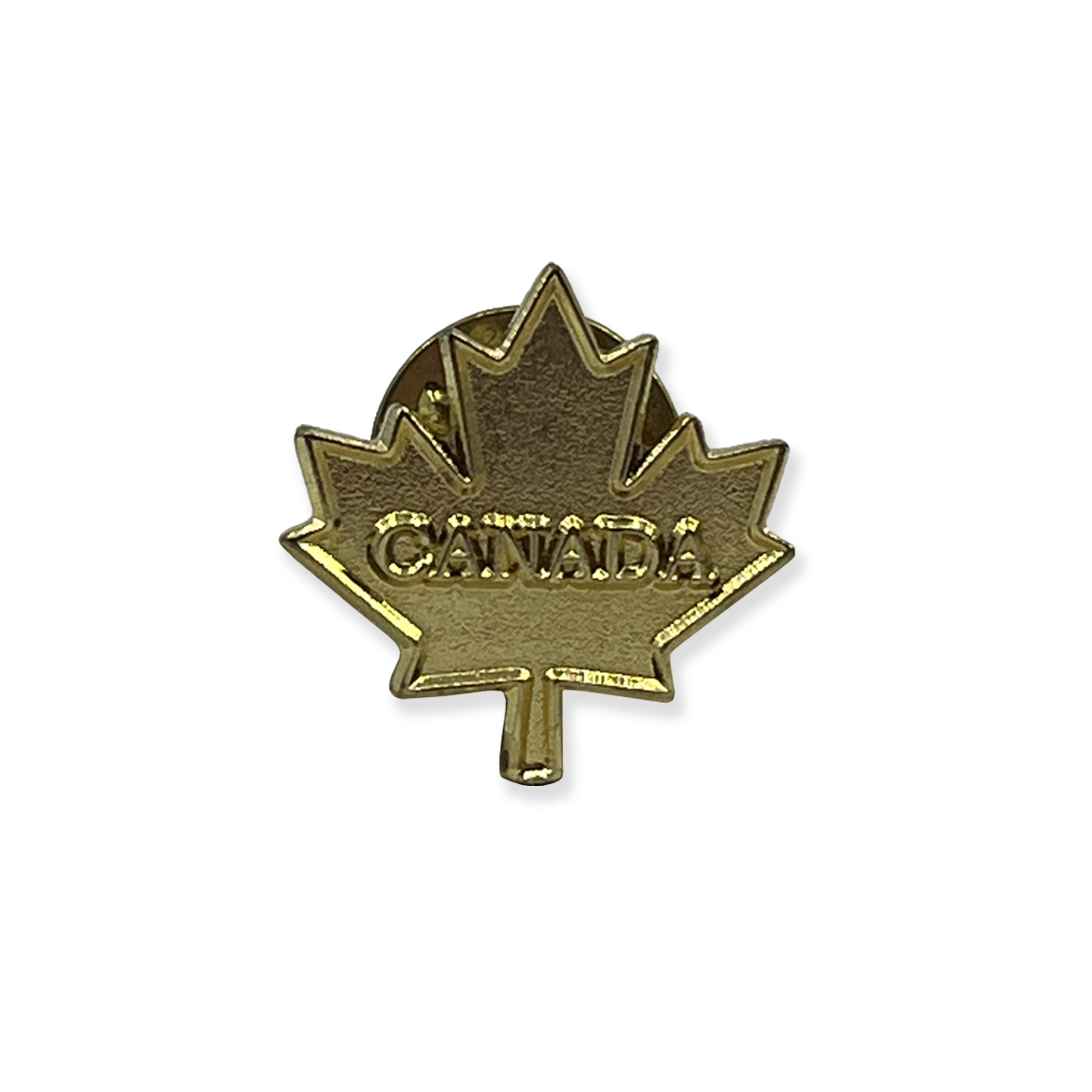 - Gold-coloured metal pin badge in the shape of a maple leaf featuring the text “CANADA”.