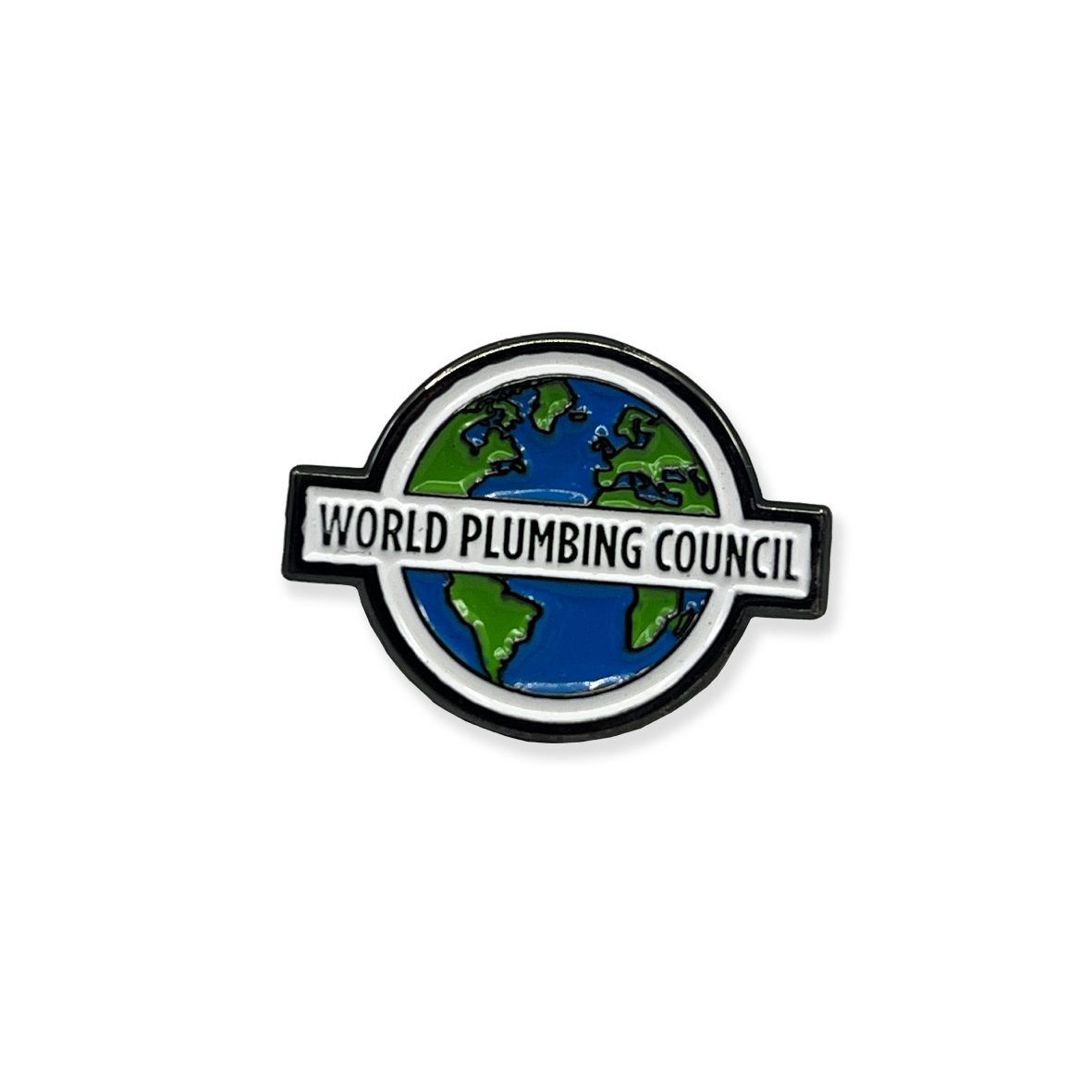 - Metal pin badge featuring a globe design with the text “WORLD PLUMBING COUNCIL”.