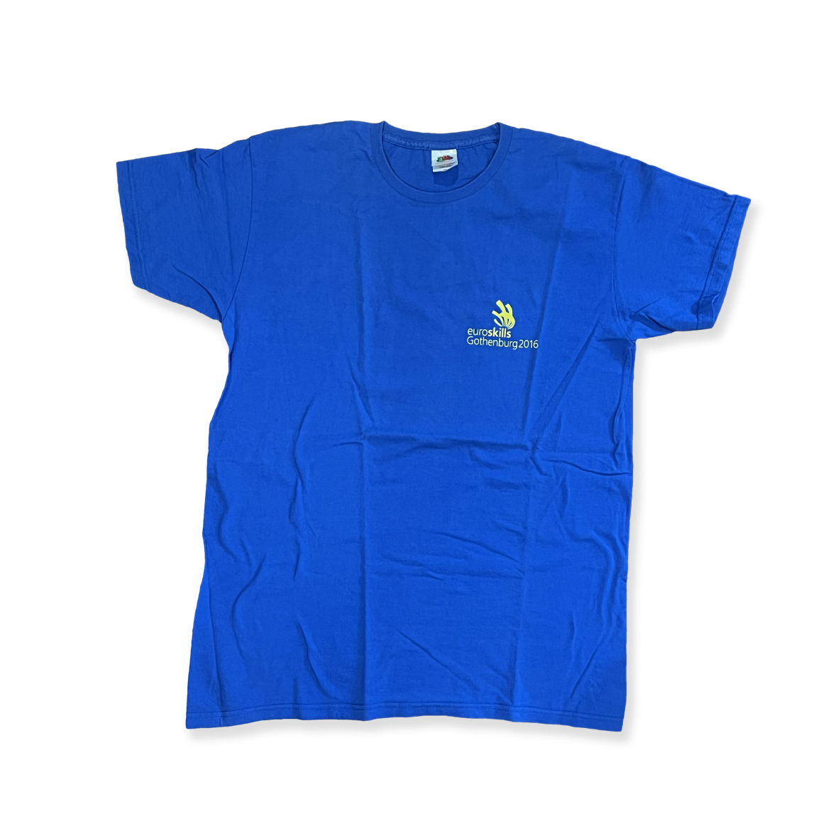 - Short-sleeved blue T-shirt featuring the EuroSkills logo and the text “EuroSkills Gothenburg 2016” printed on the chest. Produced as official event apparel for the EuroSkills Competition held in Gothenburg, Sweden, in 2016.