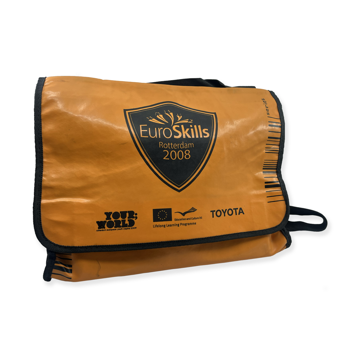 - Orange plastic bag with flap closure and black trim. The front features the “EuroSkills Rotterdam 2008” logo printed in black, along with sponsor logos. Produced for the EuroSkills Competition, Rotterdam 2008.