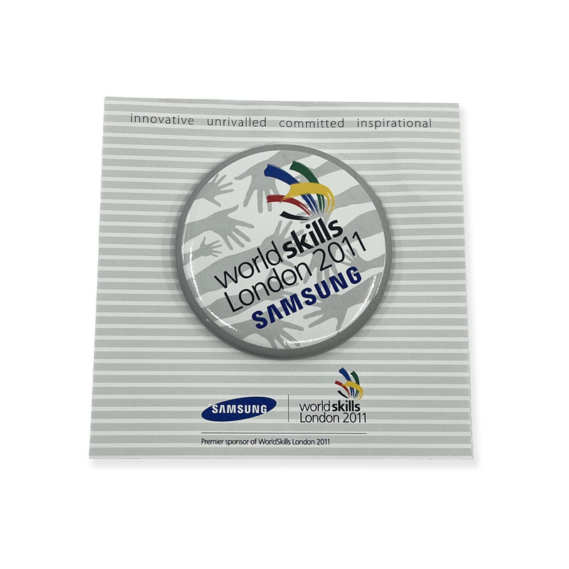 - Round pin badge featuring the “WorldSkills London 2011” logo with “Samsung” branding. The badge is mounted on its original backing card, which includes the WorldSkills branding, sponsor identification as Premier sponsor, and the words “innovative, unrivalled, committed, inspirational”. Produced for the 41st WorldSkills Competition, London 2011.