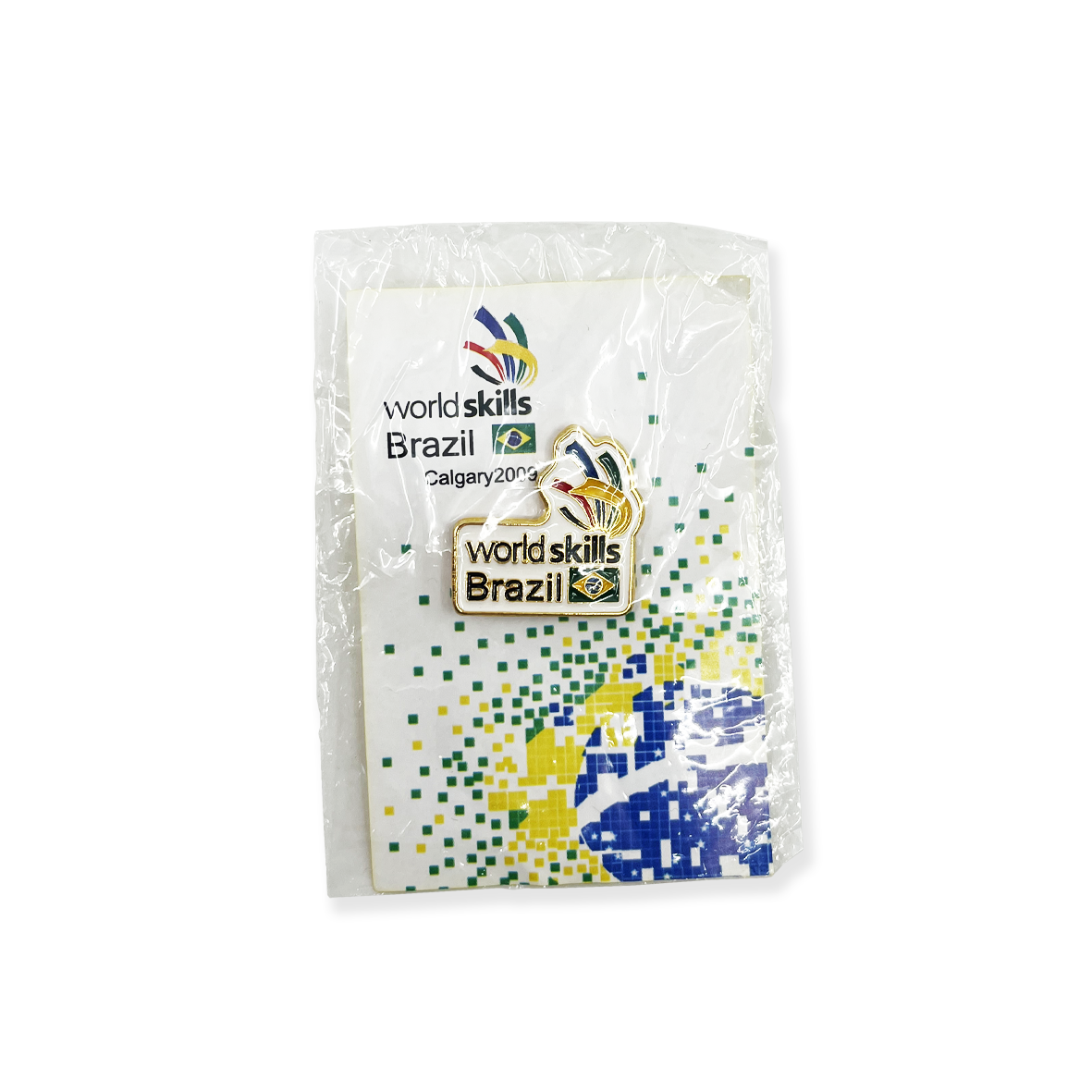 - Metal pin featuring the “WorldSkills Brazil” logo with the Brazilian flag incorporated in the design. The badge is mounted on its original printed card and sealed in a transparent plastic bag. Produced for the 40th WorldSkills Competition, Calgary 2009.