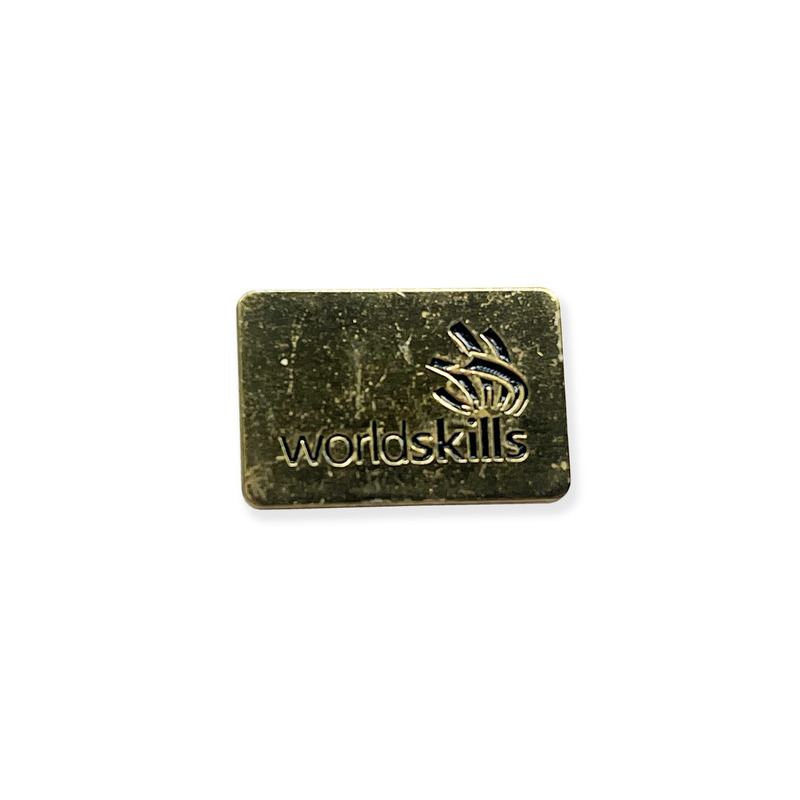 - Rectangular metal pin badge featuring the WorldSkills logo in relief on a gold-coloured background. The surface shows visible wear and patina.