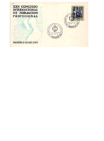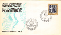 First Day Cover, Madrid 1975 Commemorative First Day Cover for the 22nd International Competition in Madrid, 1975. The envelope carries the text "XXII Concurso Internacional de Fomacion Profesional" , the words "Madrid 8-22 September 1975, and a stylised design featuring a male outline, possibly welding, looking though a face mask with a burst of sparks. It carries a 25 pesetas stamp, and is franked twice with the closing date of September 22. The frank carries the emblem of the IVTO, the words "XXII Concurso Internacional de Fomacion Profesional" and "MADRID" -