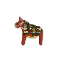 Dala horse pin Pin in the shape of a traditional Swedish Dala horse, featuring a red base with decorative painted patterns in green, yellow, and white. -